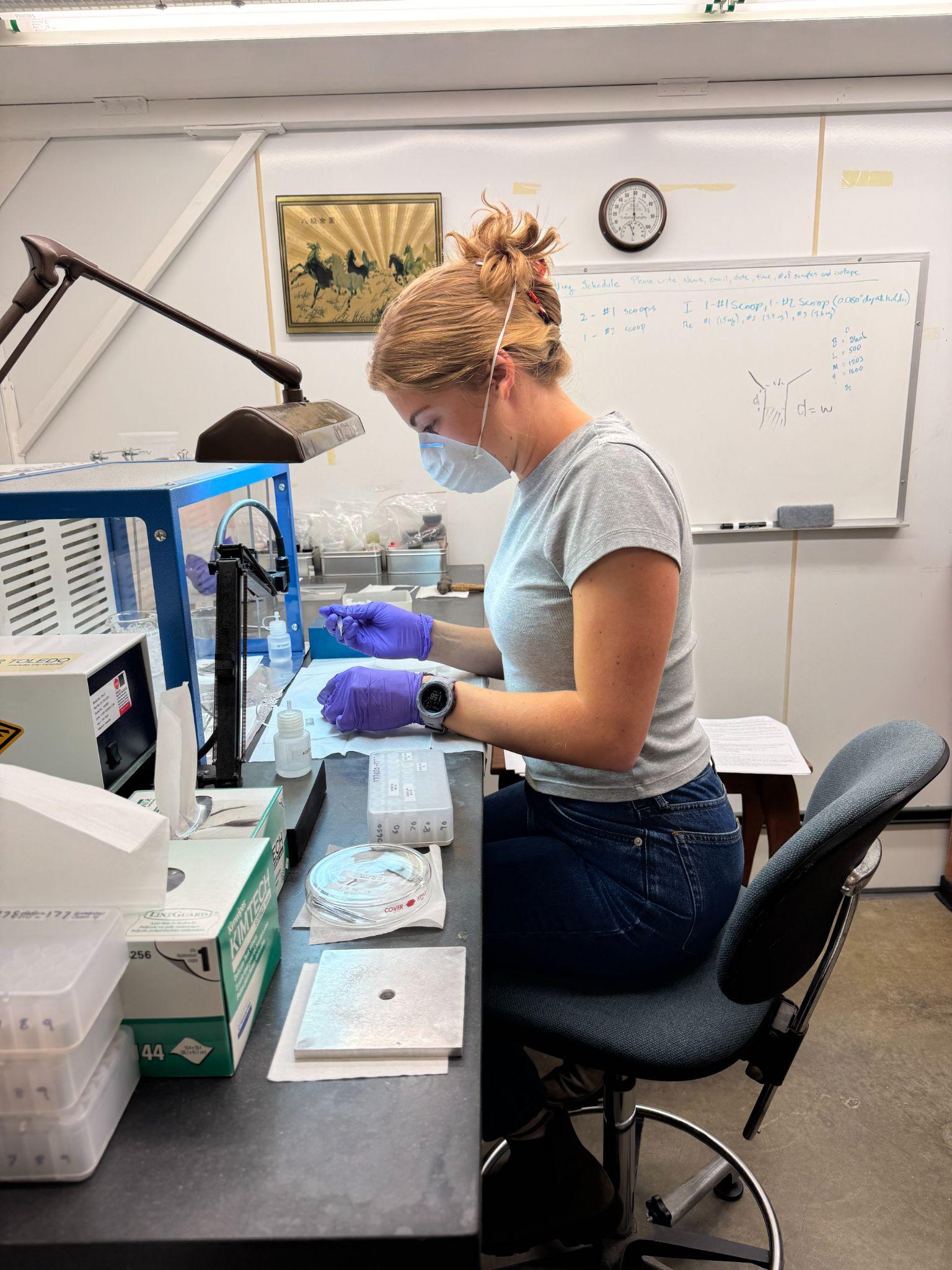Checking the yield of beryllium from her soil sample. She uses the isotope 10Be to determine rates of soil production and erosion.